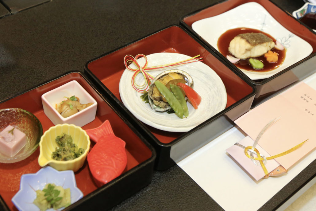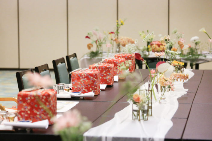 萬国屋様のお祝い重箱三段重が会場のテーブルコーディネートを