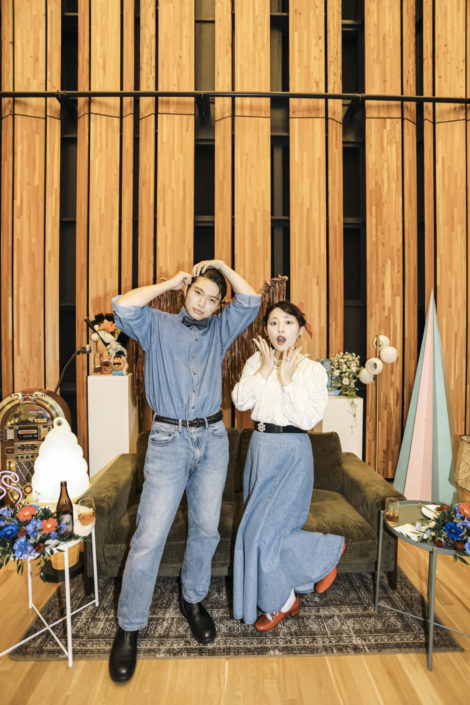 メイン席のソファやラグはお二人の自宅から運んできたもので、周りに飾ったビンテージ家具はお知り合いから借りたもの。