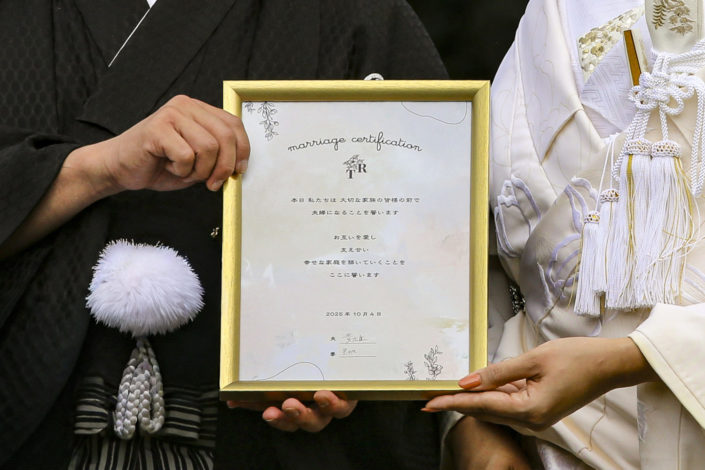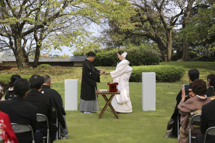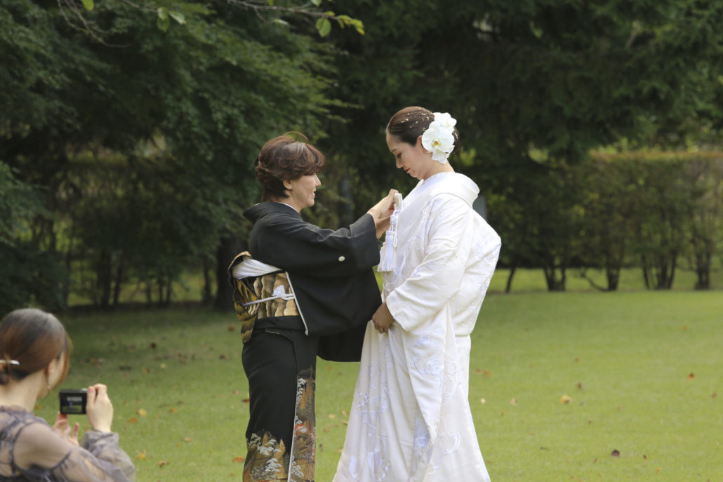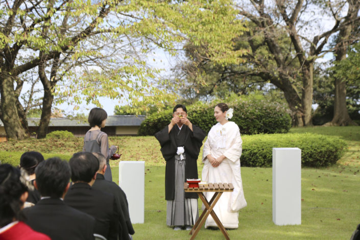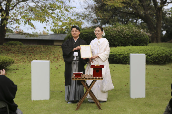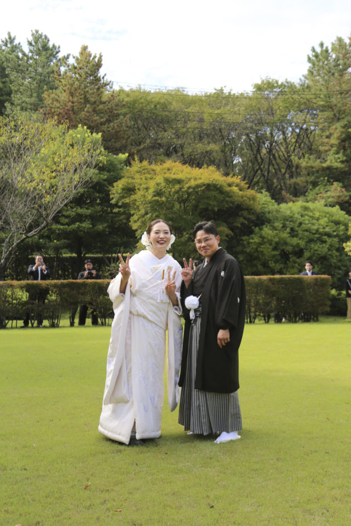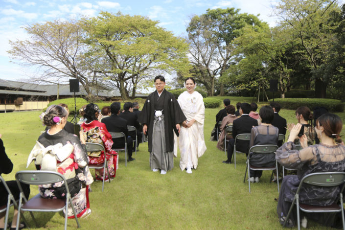 10月の過ごしやすい秋晴れの日、酒田市にある出羽遊心館様のお庭にて人前挙式を、ホテルリッチ&ガーデン酒田様にて披露宴を行いました。