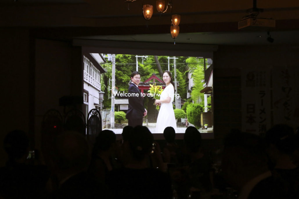 新郎新婦の入場の際は、酒田でプロジェクションマッピングの事業を営んでおられる方にお願いをし、オリジナルのプロジェクションマッピングの中入場をしました。